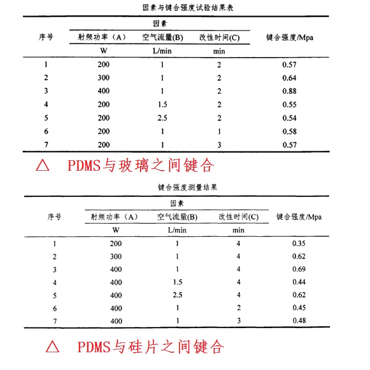 本文針對PDMS與同質(zhì)異質(zhì)的不可逆鍵合,使用等離子法對PDMS的鍵合工藝條件說明和鍵合效果展示。
