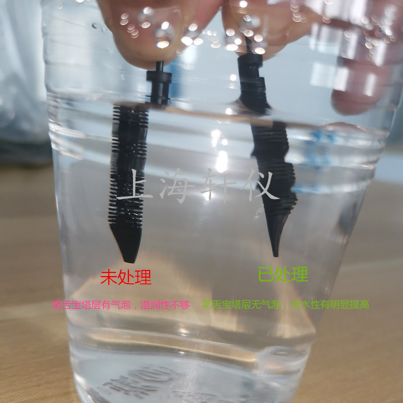 采用等離子體對筆舌表面處理,是通過氣體為介質(zhì)對筆舌表面進行清洗,可以改善材料表面潤濕性,具有處理操作簡單,容易控制,處理時間短,處理成本低,不需要化學(xué)試劑,不產(chǎn)生有害化學(xué)試劑的排放,減少了環(huán)境污染等優(yōu)點。
