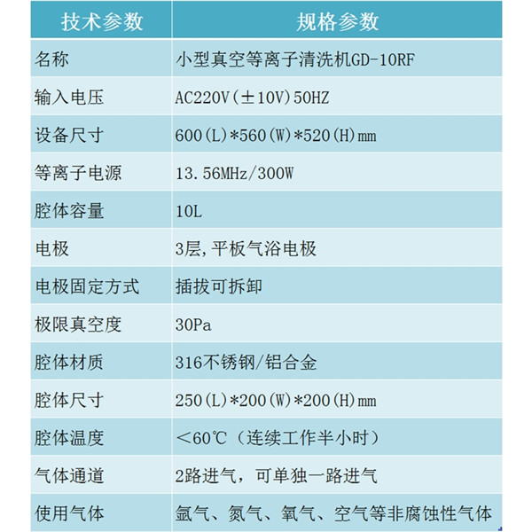 10L射頻真空等離子清洗機_實驗室等離子設(shè)備_科研機構(gòu)等離子表面處理機GD-10RF 技術(shù)參數(shù)